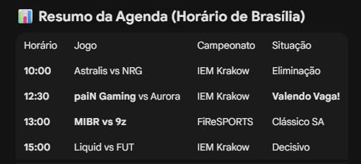 Sexta decisiva! paiN Gaming enfrenta Aurora Gaming valendo vaga na IEM Krakow (12:30h) e MIBR encara a 9z (13:00h). Veja a agenda completa e onde assistir.