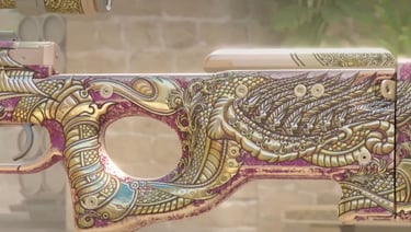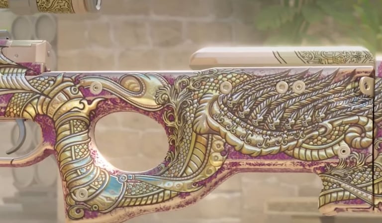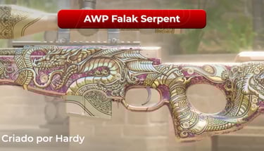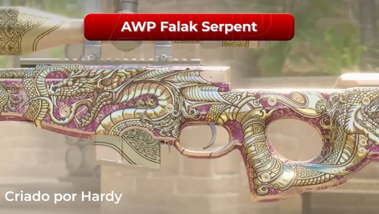 Esta aqui é especial. Ela ainda está em fase de "preview", mas já causou um impacto enorme. Baseada na criatura mitológica Falac, uma serpente gigante da cultura local, esta AWP é repleta de detalhes dourados e escamas em relevo.