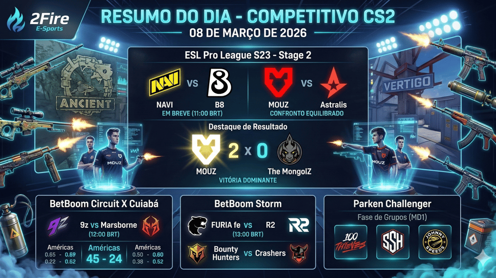 Se você, assim como eu, é da época que a gente pagava dois reais por hora na lan house pra jogar na de_dust2 com monitor de tubo e mouse com bolinha, sabe que domingo não é dia de descanso. Domingo é dia de Counter-Strike 2, meu amigo! E hoje, 8 de março de 2026, o servidor da ESL Pro League Season 23 tá simplesmente derretendo. A fase suíça tá rolando solta, as equipes estão com a corda no pescoço e a gente tá aqui, sofrendo e vibrando a cada headshot.