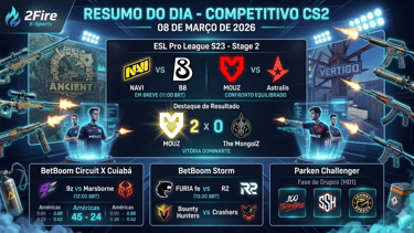 O servidor tá on fire! Rafael (2Fire esports) resume os jogos de hoje (08/03) da ESL Pro League S23: atropelo da MOUZ, NAVI favorita, clássico europeu e Legacy na luta. Confira!